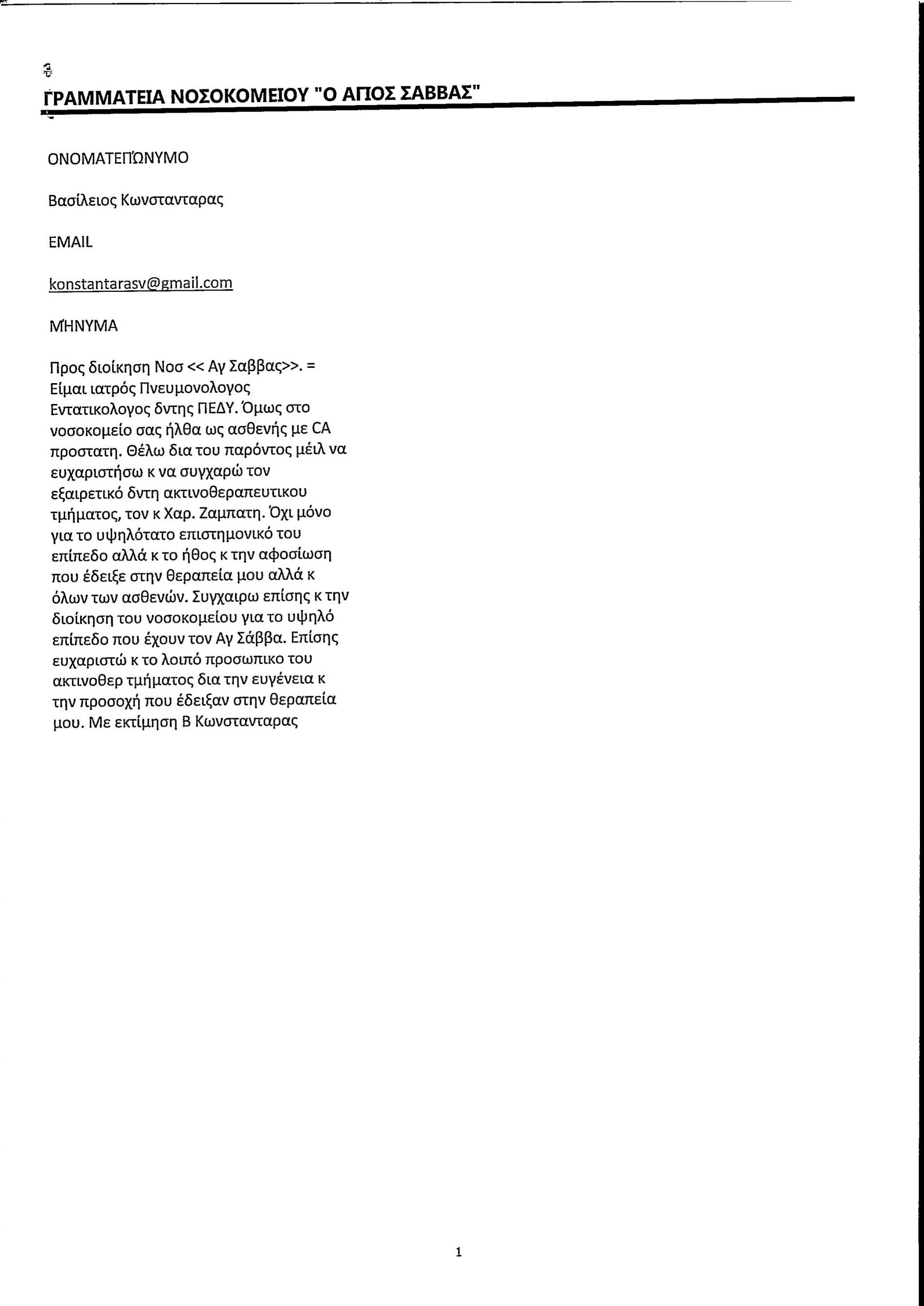 Ευχαριστήρια επιστολή κ. Βασίλη Κωνσταντάρα
